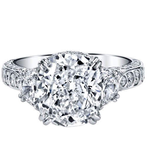 Splendid romance should be signified with this beautiful three-stone ring. On the center, is a dazzling 4.42 carat Kotlar Cushion diamond gracefully framed with two smaller diamonds on each side. Set in platinum, the band is replete with diamonds arranged in an Artisan Pavé scallop pattern. Truly captivating, this magnificent Harry Kotlar ring absolutely blooms with romance.