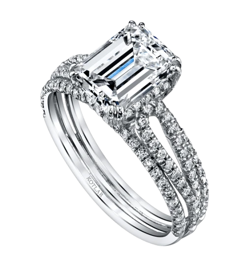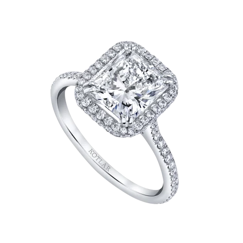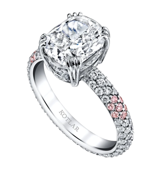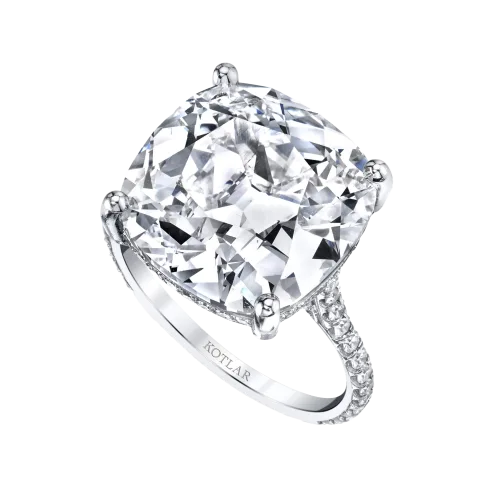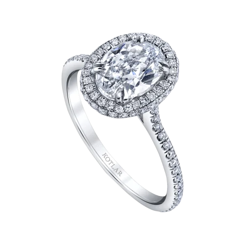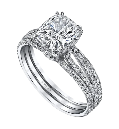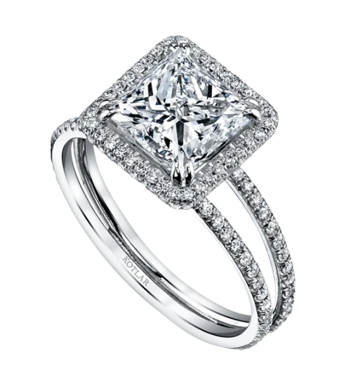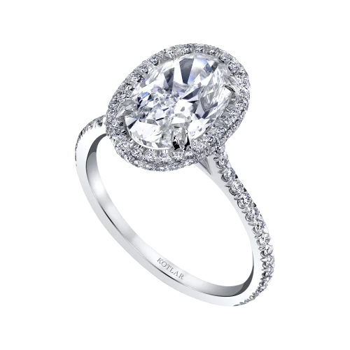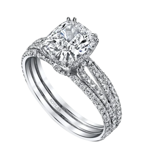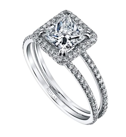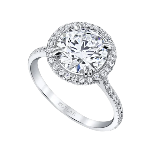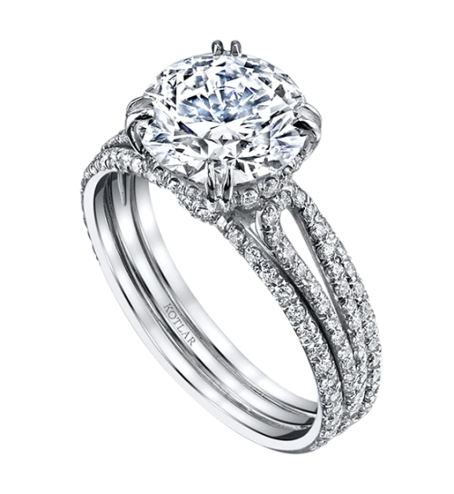 <p>Delicate micro pave wraps around a split wire Harry Kotlar platinum band to showcase a round brilliant diamond backed with layers of micro pave for extra twinkle power.</p>