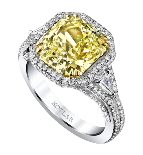 <p>Glowing with romance, this Harry Kotlar ring from the Luminesce collection is set within a split pave bezel setting and seems to radiate sunlight with double rows of pave leading up to a magnificent halo around a Kotlar cushion diamond set atop delicate rows of micro pave in yellow gold.</p>