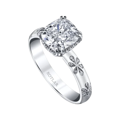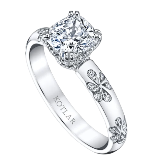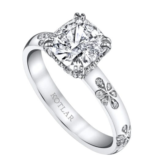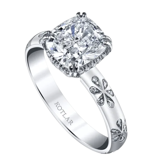 <p>A dazzling tribute to love, this Harry Kotlar ring sparkles with a 1.67 carat solitaire Kotlar Cushion diamond set in platinum. It is complemented by a showcase of lovely Artisan Pavé Flower-styled diamonds. This ring inspires a strong desire to "love and to hold."</p>