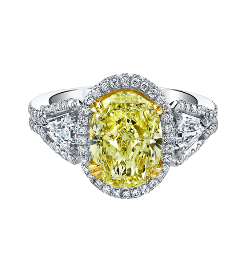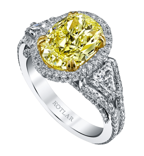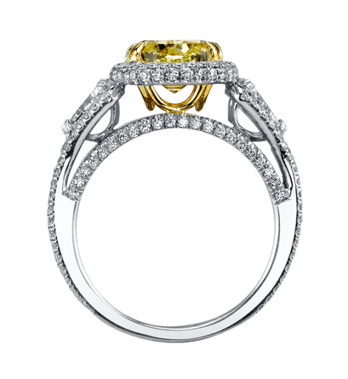A stately oval diamond set in yellow gold is the centerpiece of this ornately crafted Harry Kotlar ring that drips with diamonds. Dazzling in every aspect two diamonds frame the center stone while pave diamonds encircle every part of the band.